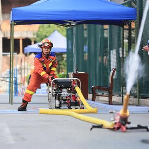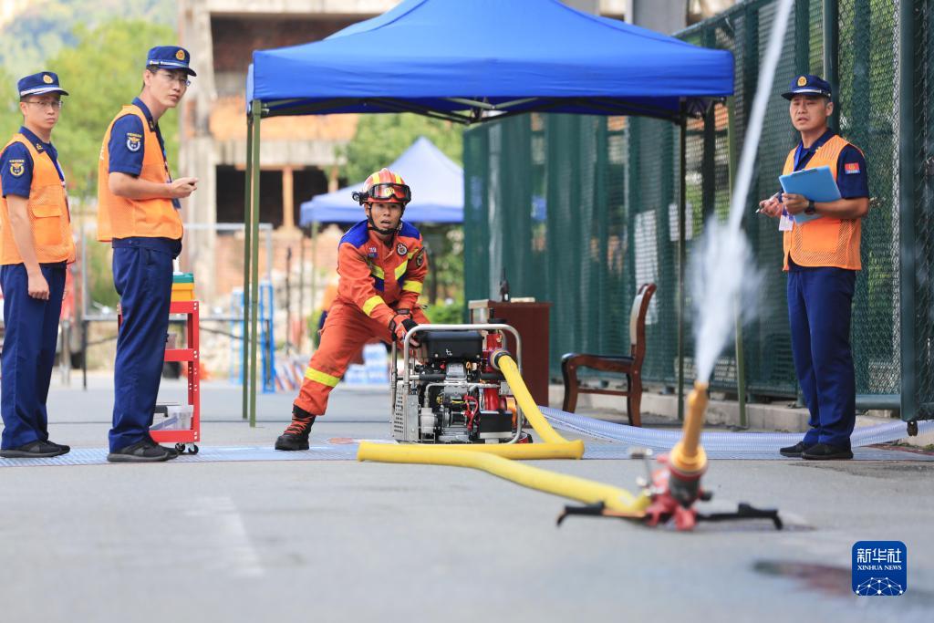 9月25日,在2023年福建省消防行業(yè)職業(yè)技能競賽現場(chǎng),消防員參加“手抬機動(dòng)泵維護及射水打靶”項目的比拼。