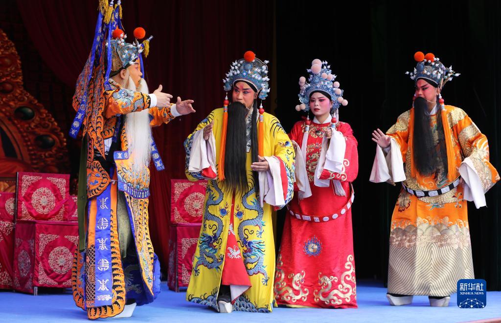 中國戲劇梅花獎得主、來(lái)自寧夏秦腔劇院的國家一級演員李小雄(左一)在甘肅省定西市體育公園演唱秦腔經(jīng)典傳統劇《金沙灘》(9月21日攝)。