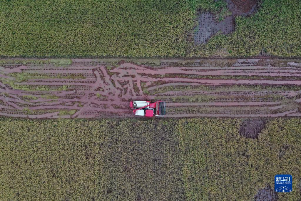 9月25日, 重慶市巫山縣廟宇鎮永安村村民在搶收受災農田里的水稻(無(wú)人機照片)。