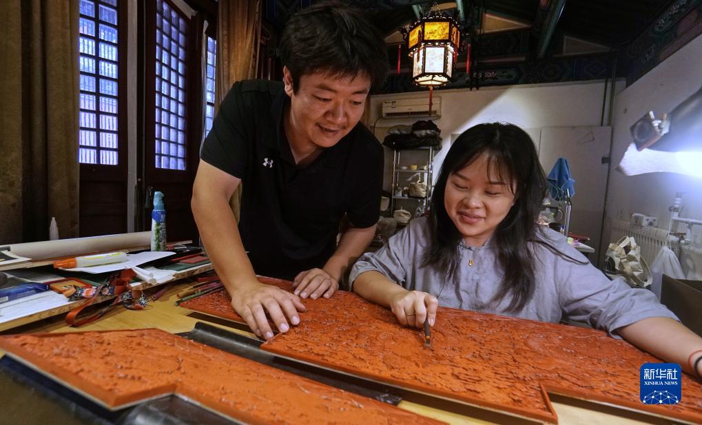 海燕和同為雕漆技師的丈夫劉楠(左)在研究大型雕漆作品的雕刻問(wèn)題(9月19日攝)。