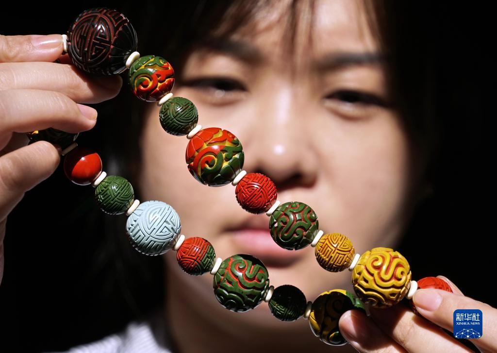 海燕在展示采取新的髹漆技術(shù)制作的多色雕漆裝飾球(9月21日攝)。