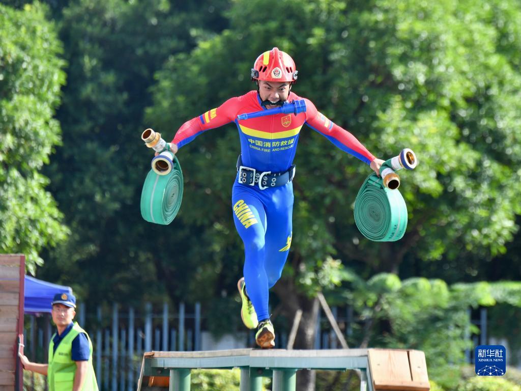 9月26日,參賽選手在進(jìn)行100米消防障礙比賽。