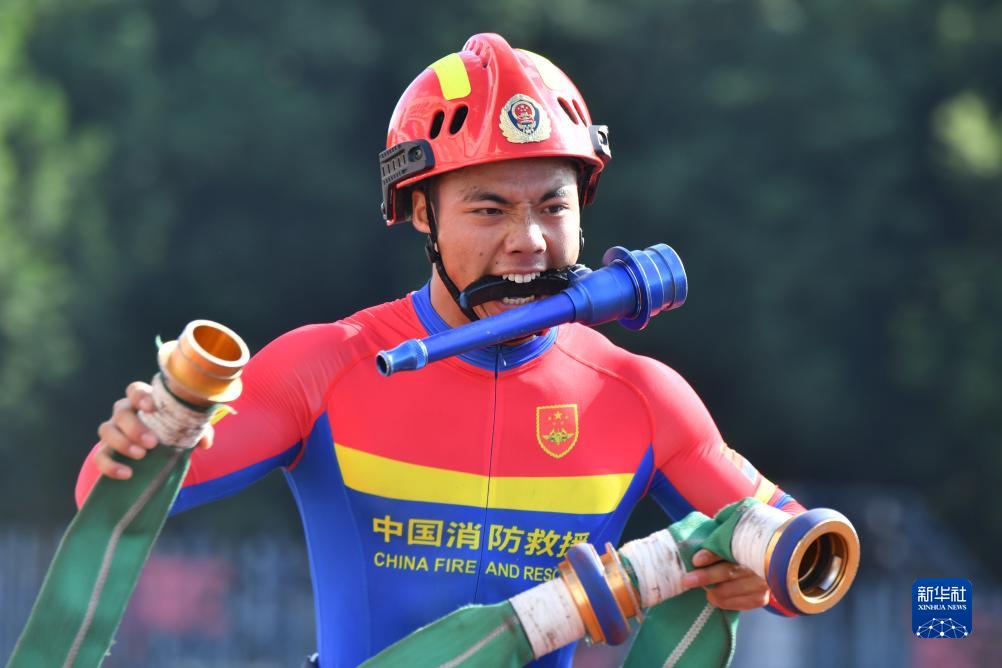 9月26日,參賽選手在進(jìn)行100米消防障礙比賽。