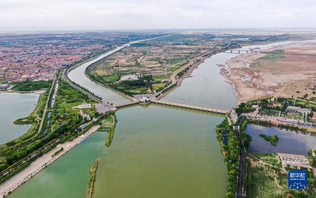 這是被譽(yù)為“萬(wàn)里黃河第一閘”的三盛公水利樞紐,內蒙古每年利用三盛公水利樞紐定量分流黃河凌汛水、灌溉間隙水,統籌實(shí)施烏梁素海生態(tài)補水(無(wú)人機照片,6月6日攝)。