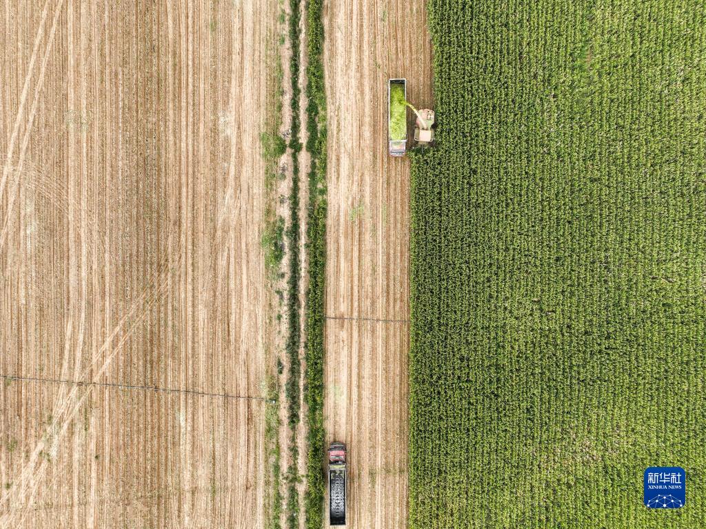 在內蒙古巴彥淖爾市臨河區城關(guān)鎮,收割機在收割青儲玉米(無(wú)人機照片,9月14日攝)。