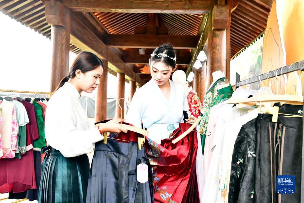 9月26日,在第九屆尼山世界文明論壇“山東手造”精品展區,與會(huì )人員在挑選曹縣漢服。
