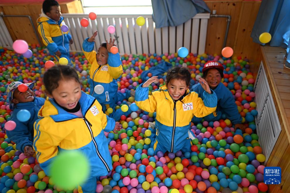 在曲麻萊縣秋智鄉幼兒園,昂文拉毛(右二)和伙伴們在教室內玩耍(9月13日攝)。