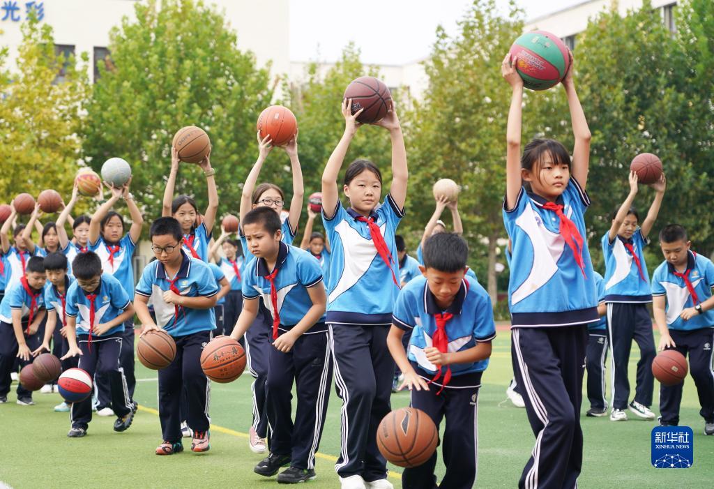 9月26日,秦皇島市海港區明珠學(xué)校的學(xué)生在大課間練習“花式”籃球操。