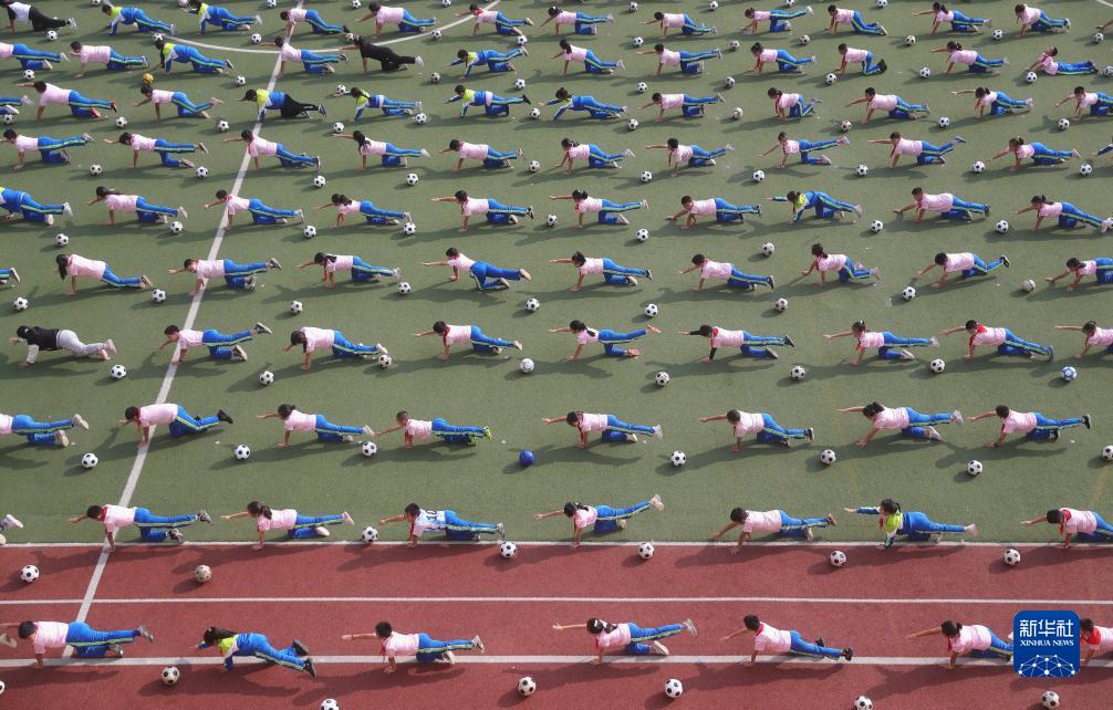 9月26日,河北省秦皇島市海港區耀華小學(xué)的學(xué)生在大課間練習足球操。