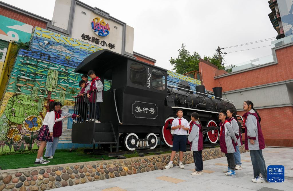 9月26日,在重慶鐵路小學(xué)校園內的火車(chē)模型前,鐵路小學(xué)的兩名學(xué)生代表(左一、右五)向受邀來(lái)訪(fǎng)的城口縣蓼子鄉第一中心小學(xué)學(xué)生代表介紹自己學(xué)校的歷史。