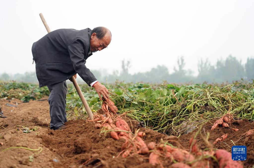 9月27日,在北京市平谷區夏各莊鎮賢王莊村的一處紅薯地,村民在挖紅薯。
