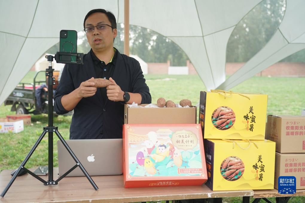9月27日,工作人員在夏各莊鎮第五屆紅薯文化節現場(chǎng)通過(guò)視頻直播的方式售賣(mài)紅薯。