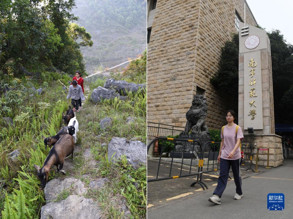 這是一張拼版照片,左圖為:在廣西都安瑤族自治縣拉烈鎮崇業(yè)村弄后屯,藍曉萍(后)和妹妹藍云萍放學(xué)回家后放羊(2015年4月14日攝);右圖為:在廣西南寧師范大學(xué),藍曉萍放學(xué)后走出校門(mén)(2023年9月26日攝)。