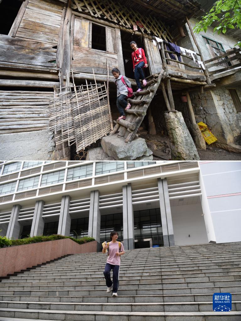 這是一張拼版照片,上圖為:在廣西都安瑤族自治縣拉烈鎮崇業(yè)村弄后屯,藍曉萍(后)和妹妹藍云萍走出家門(mén)去上學(xué)(2015年4月14日攝);下圖為:在廣西南寧師范大學(xué),藍曉萍走出學(xué)校圖書(shū)館(2023年9月26日攝)。