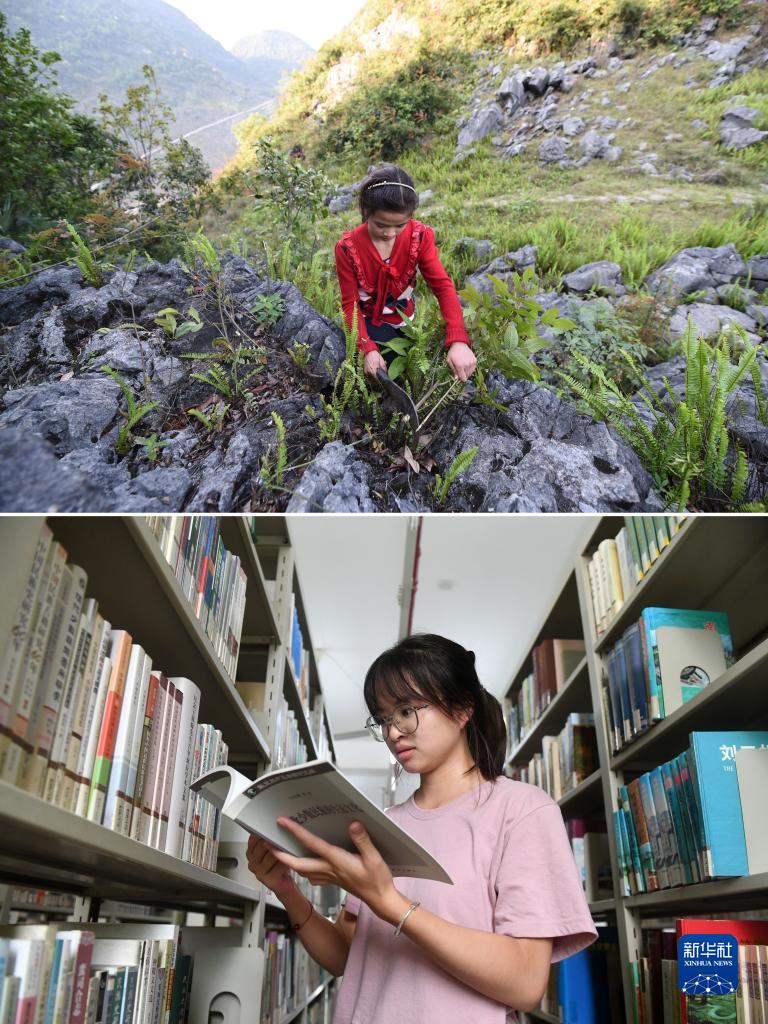 這是一張拼版照片,上圖為:在廣西都安瑤族自治縣拉烈鎮崇業(yè)村弄后屯,藍曉萍放學(xué)回家后在山上一邊放羊一邊砍柴(2015年4月14日攝);下圖為:在廣西南寧師范大學(xué),藍曉萍在圖書(shū)館里看書(shū)(2023年9月26日攝)。