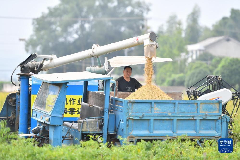 金秋時(shí)節,湖南省瀏陽(yáng)市沿溪鎮種植的中稻迎來(lái)收獲季,當地農民搶抓農時(shí)收割水稻,稻田里一派繁忙景象。