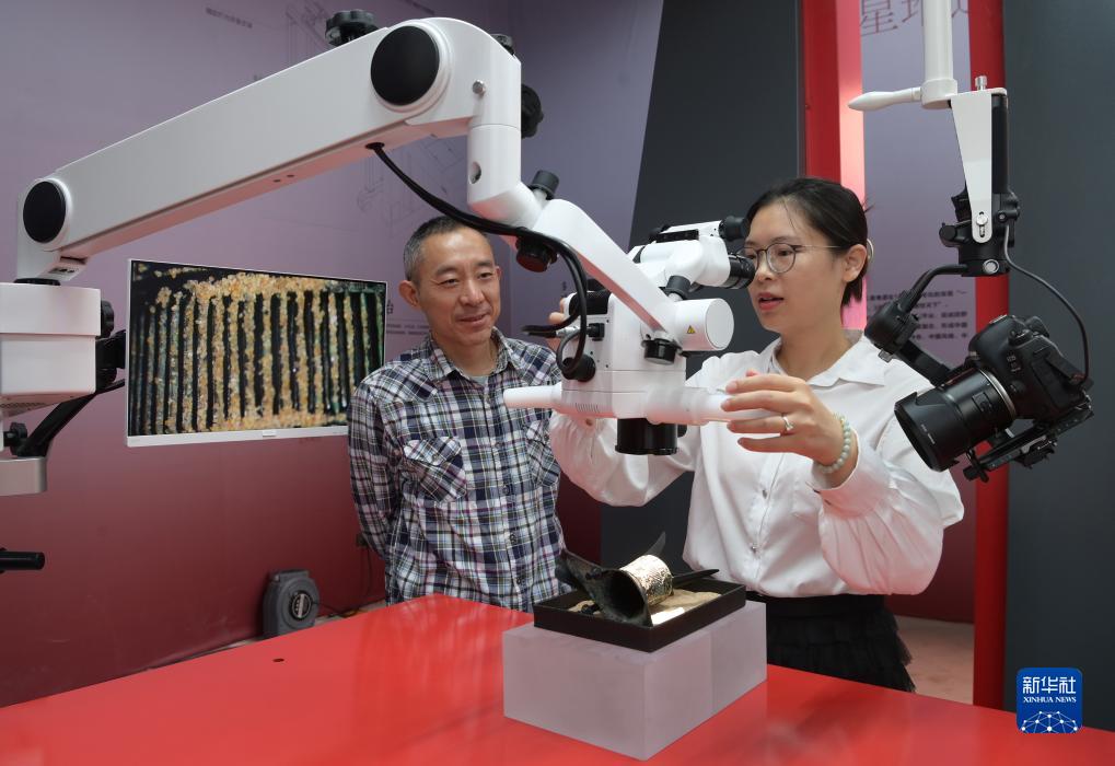 9月27日,一位工作人員(右)在展臺向觀(guān)眾介紹實(shí)驗室考古設備。