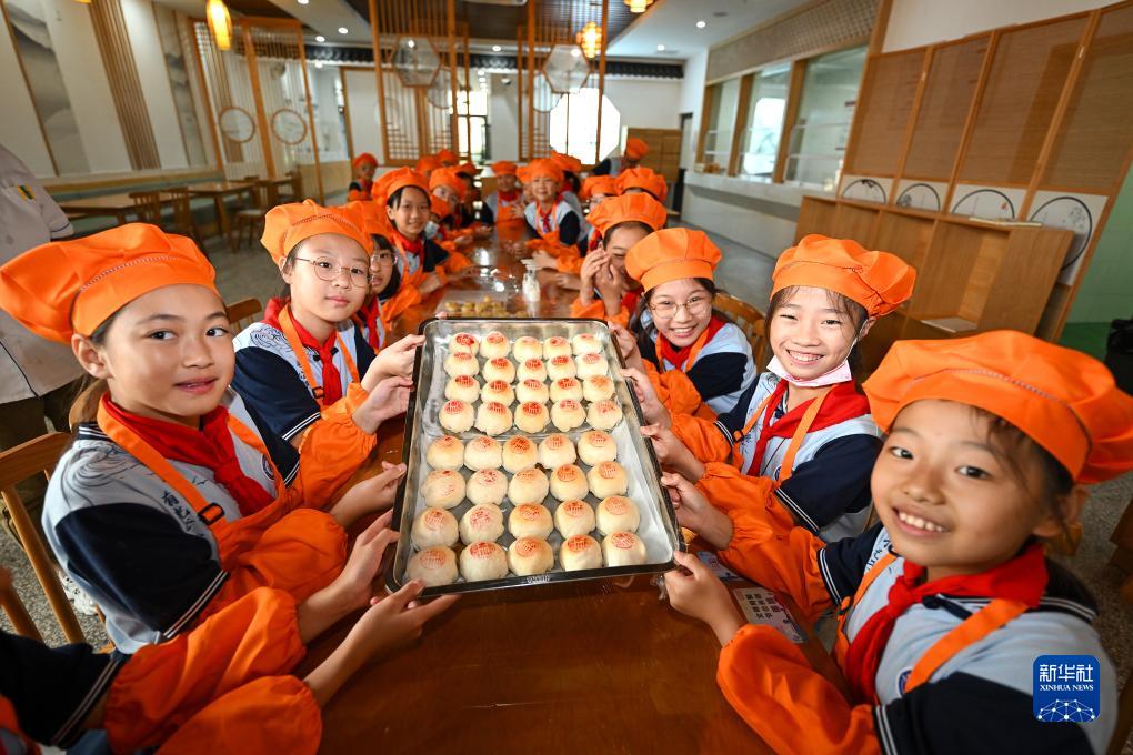 9月27日,在江蘇省昆山開(kāi)發(fā)區震川小學(xué),學(xué)生們展示烘焙好的月餅。