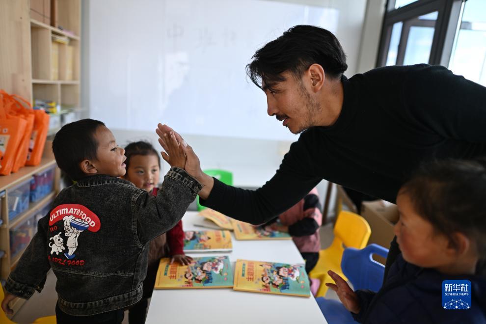 在青海省玉樹(shù)藏族自治州曲麻萊縣秋智鄉布甫村陽(yáng)光幼兒園,秋智鄉幼兒園副園長(cháng)才仁戰斗(右二)在課堂上和小朋友互動(dòng)(9月14日攝)。