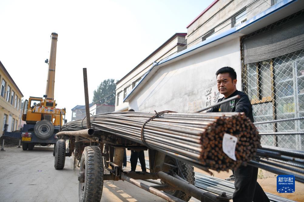 9月26日,工人在河北保定涿州市刁窩鎮刁四村一處受損房屋修復現場(chǎng)搬運鋼筋。