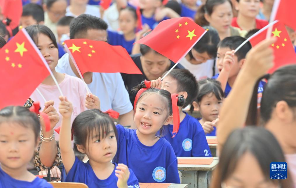 9月28日,在梧州市龍圩區龍圩中心小學(xué),學(xué)生們在主題活動(dòng)中揮舞國旗。