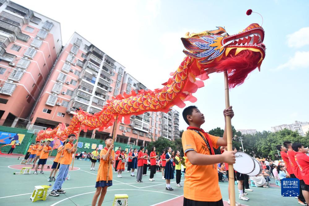 9月28日,在梧州市龍圩區龍圩中心小學(xué),小學(xué)生們在舞龍。