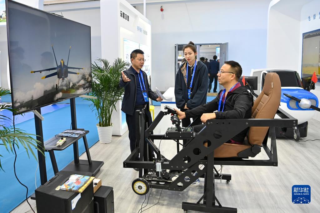 9月28日,參觀(guān)者在2023太原國際通用航空博覽會(huì )上體驗模擬飛行系統。