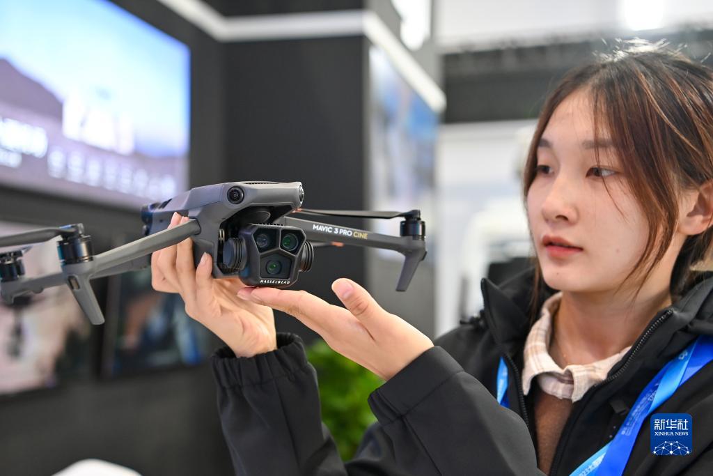 9月28日,在2023太原國際通用航空博覽會(huì )上,一名參展商工作人員展示一款無(wú)人機。