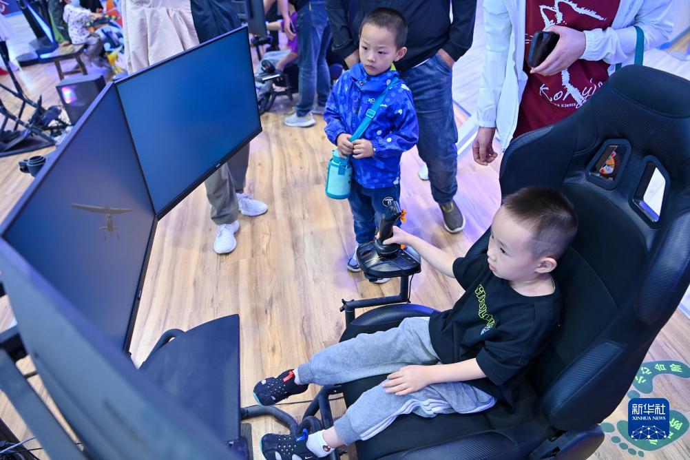 9月28日,小朋友在2023太原國際通用航空博覽會(huì )上體驗模擬飛行系統。