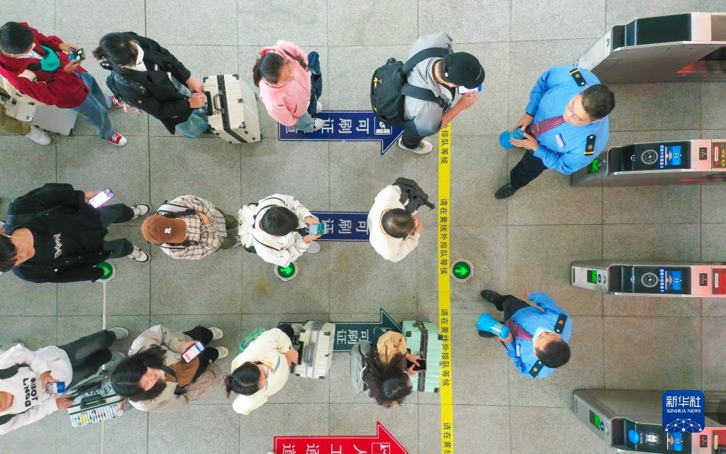 9月28日,在河南省焦作市武陟縣高鐵站,旅客在閘機門(mén)口排隊等候檢票(無(wú)人機照片)。