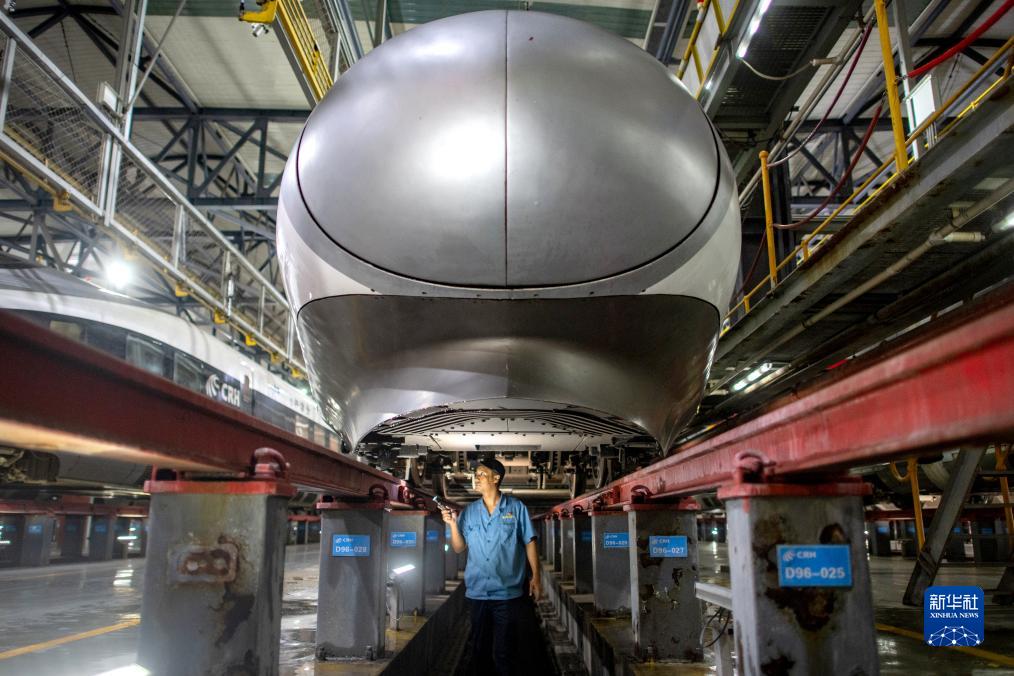 馬耀鋒在動(dòng)車(chē)組車(chē)底巡檢(9月26日攝)。