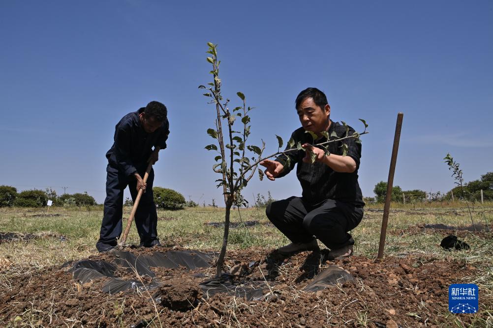 9月27日,在位于厄立特里亞阿斯馬拉的農業(yè)技術(shù)援助項目示范地,中國援厄第三期高級農業(yè)專(zhuān)家組果樹(shù)作物專(zhuān)家王力(右)與當地農戶(hù)共同進(jìn)行蘋(píng)果樹(shù)苗的田間管理。