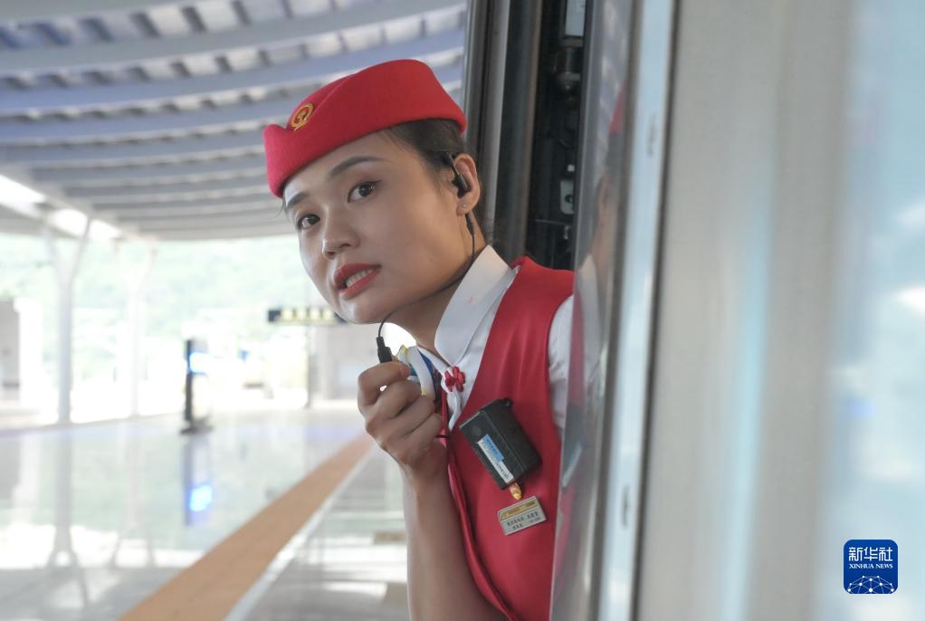 首發(fā)車(chē)G9801次列車(chē)長(cháng)車(chē)艷雪和她的同事登上福廈高鐵復興號智能動(dòng)車(chē)組為乘客服務(wù)?!霸诹熊?chē)上我們要用心用情做好服務(wù),讓乘坐福廈高鐵的乘客在旅行中享受到不一樣的跨海之旅,展現我們海上‘高姐’的風(fēng)采?!避?chē)艷雪說(shuō)。