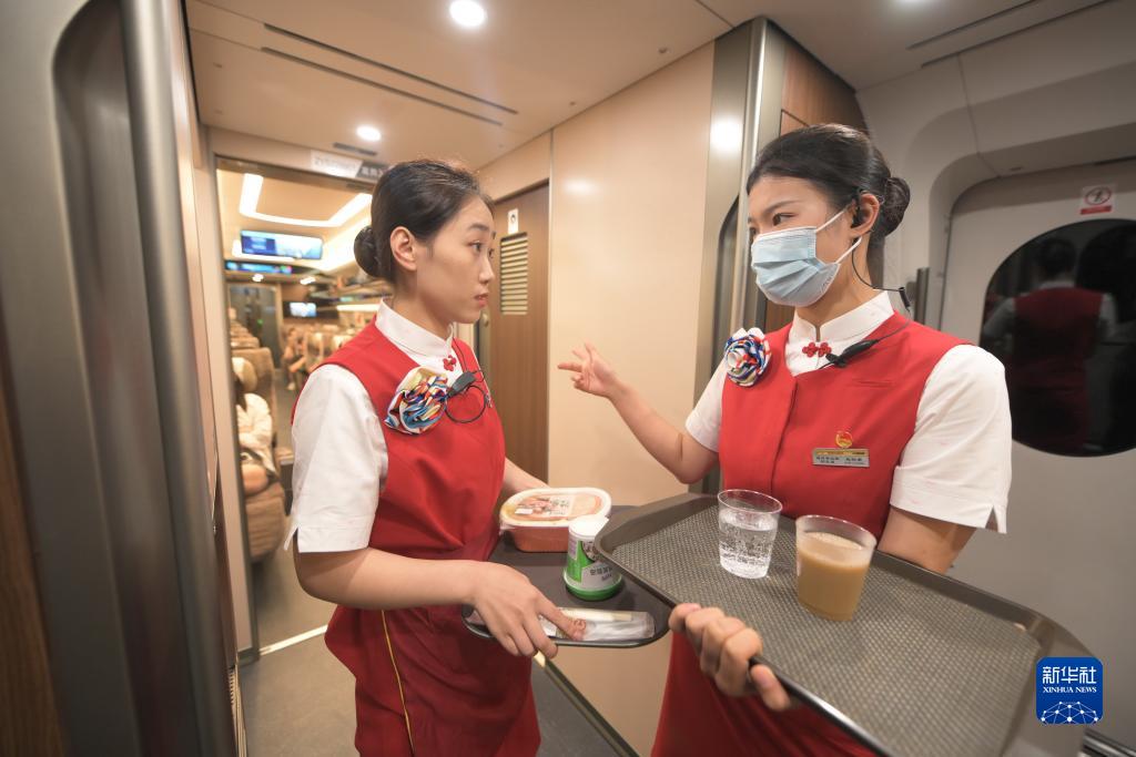 9月28日,列車(chē)員趙怡君(右)和餐服員鄭智麗為商務(wù)座旅客提供餐食和飲品服務(wù)。