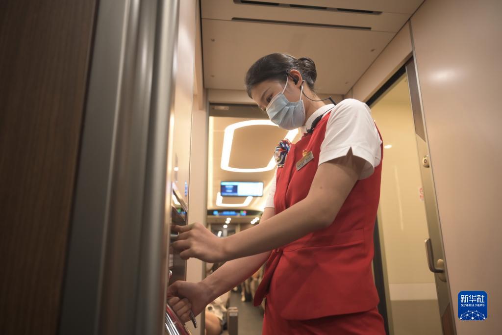 首發(fā)車(chē)G9801次列車(chē)長(cháng)車(chē)艷雪和她的同事登上福廈高鐵復興號智能動(dòng)車(chē)組為乘客服務(wù)?!霸诹熊?chē)上我們要用心用情做好服務(wù),讓乘坐福廈高鐵的乘客在旅行中享受到不一樣的跨海之旅,展現我們海上‘高姐’的風(fēng)采?!避?chē)艷雪說(shuō)。