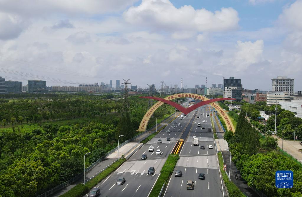 這是位于上海外高橋保稅區的中國(上海)自由貿易試驗區的標志“海鷗門(mén)”(2023年8月1日攝,無(wú)人機照片)。