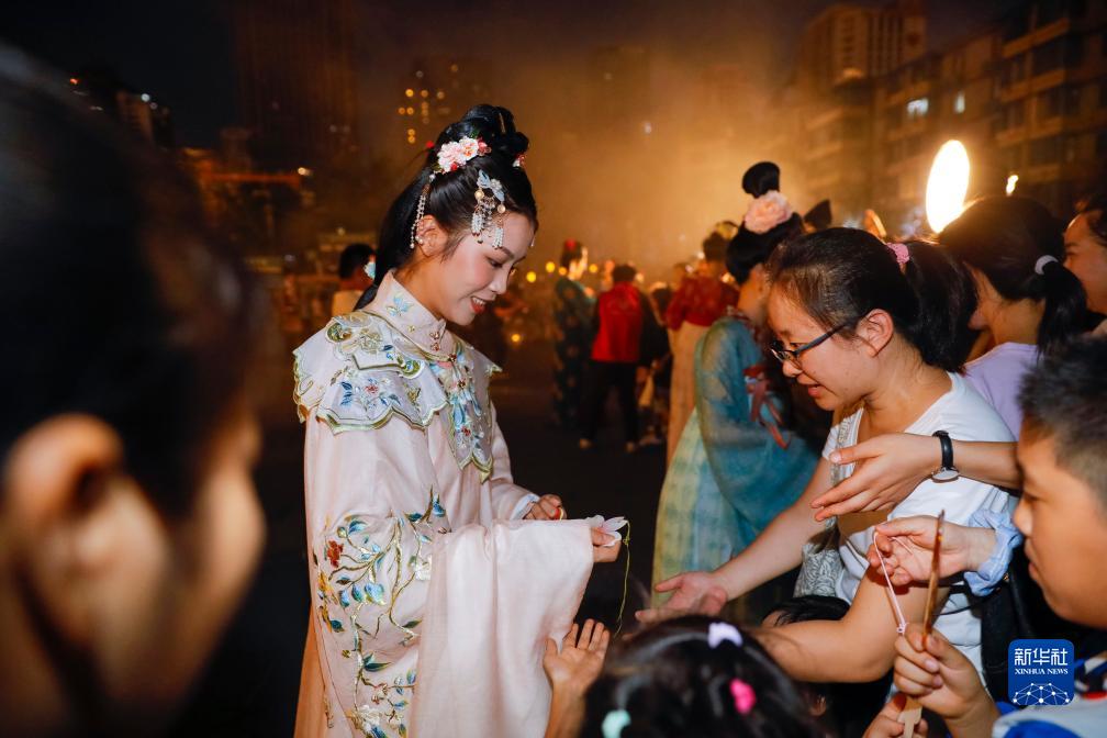 9月29日,在四川省成都市東華門(mén)遺址公園,觀(guān)眾在沉浸式演出中與演員互動(dòng)。