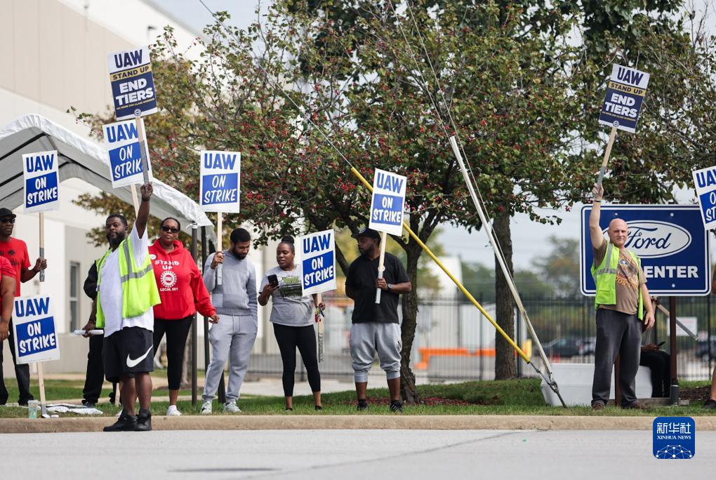 9月29日,在美國芝加哥南郊的福特汽車(chē)裝配廠(chǎng),工人參與罷工示威活動(dòng)。