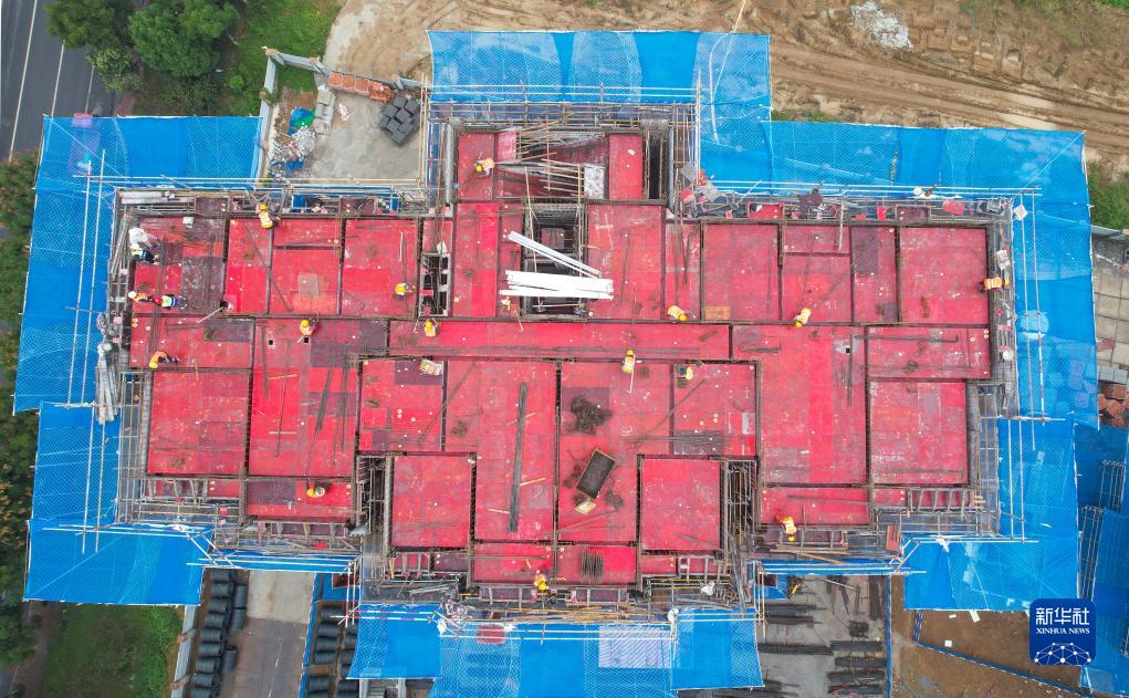 9月30日,中建二局工人在安徽合肥肥西產(chǎn)城融合安置點(diǎn)二期工地作業(yè)(無(wú)人機照片)。