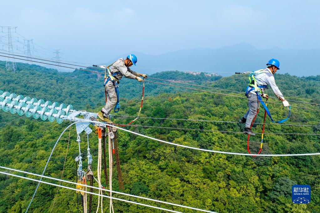 在安徽銅陵500千伏銅官線(xiàn)改造工程架線(xiàn)施工現場(chǎng),安徽送變電工程有限公司施工人員在高空中作業(yè)(9月30日,無(wú)人機照片)。