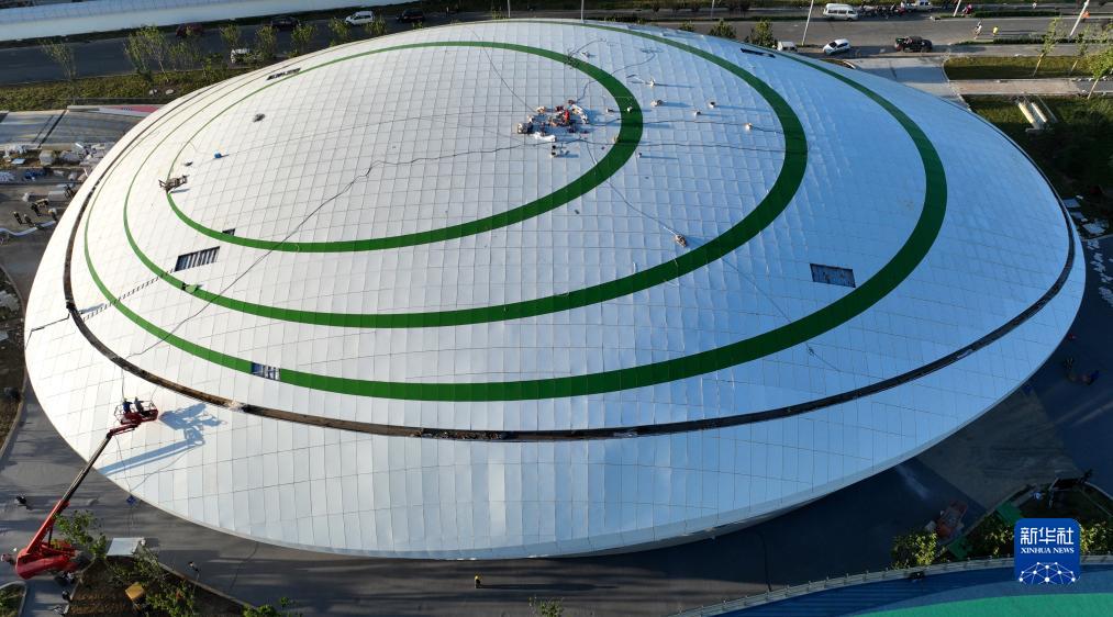 9月30日,建設者在河北省石家莊市高鐵片區中央綠色體育公園網(wǎng)球館施工。