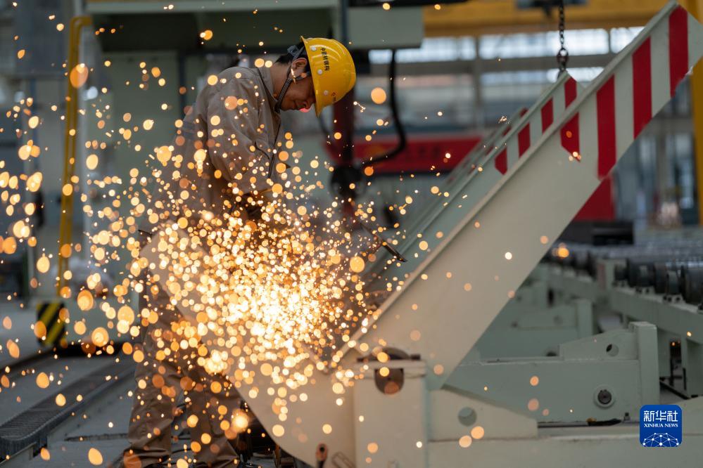 9月30日,安徽省合肥市肥東縣合肥循環(huán)經(jīng)濟示范園中建材鋼構生產(chǎn)車(chē)間內,工人在打磨鋼構產(chǎn)品。