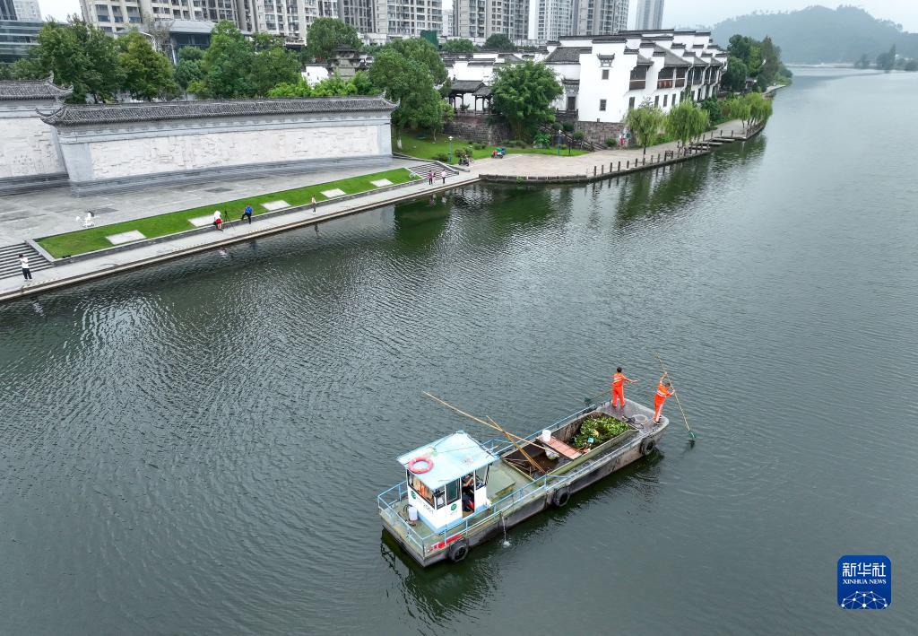 9月30日,在安徽省黃山市屯溪區,保潔員在新安江江面上打撈漂浮物(無(wú)人機照片) 。