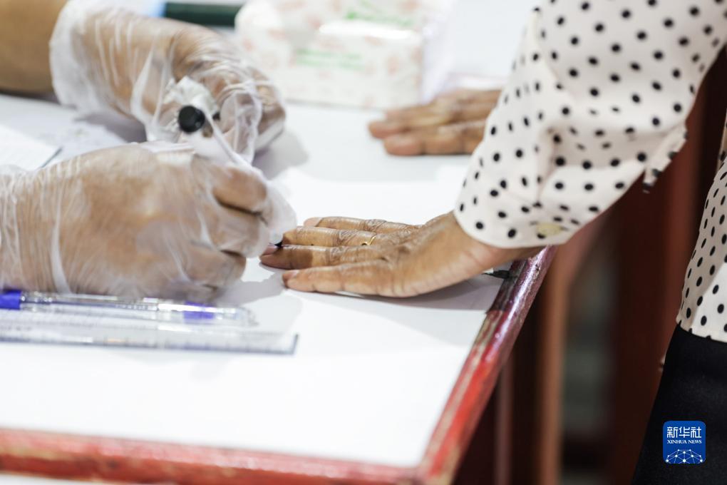 9月30日,工作人員在馬爾代夫首都馬累的投票站給一名選民做投票標記。