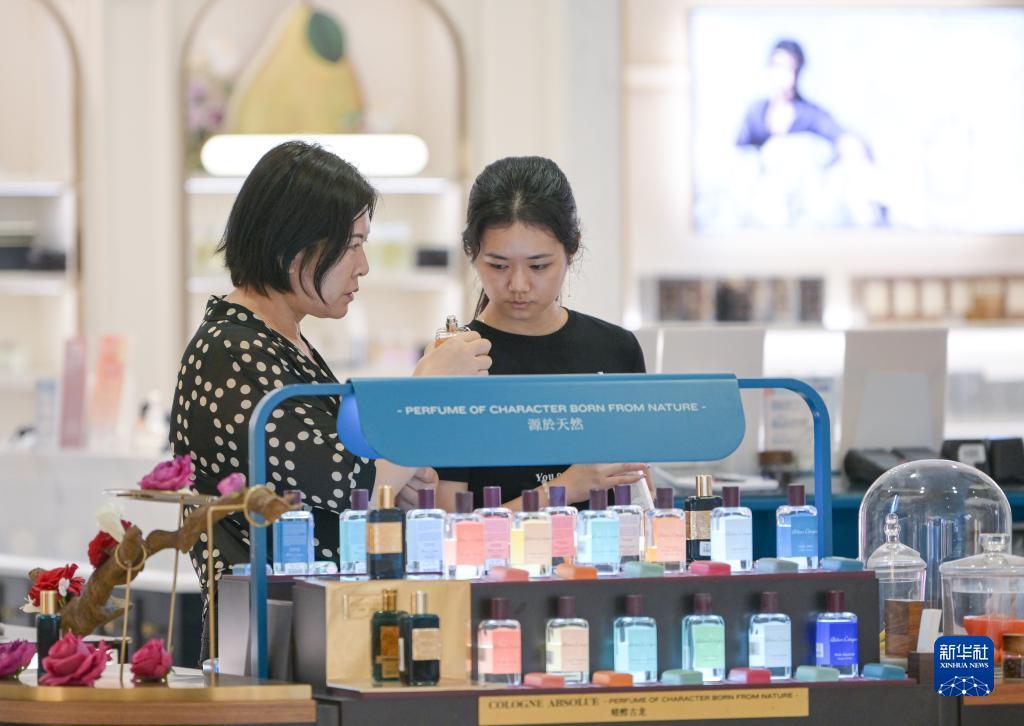 9月29日,消費者在中免集團??谌赵聫V場(chǎng)免稅店選購商品。