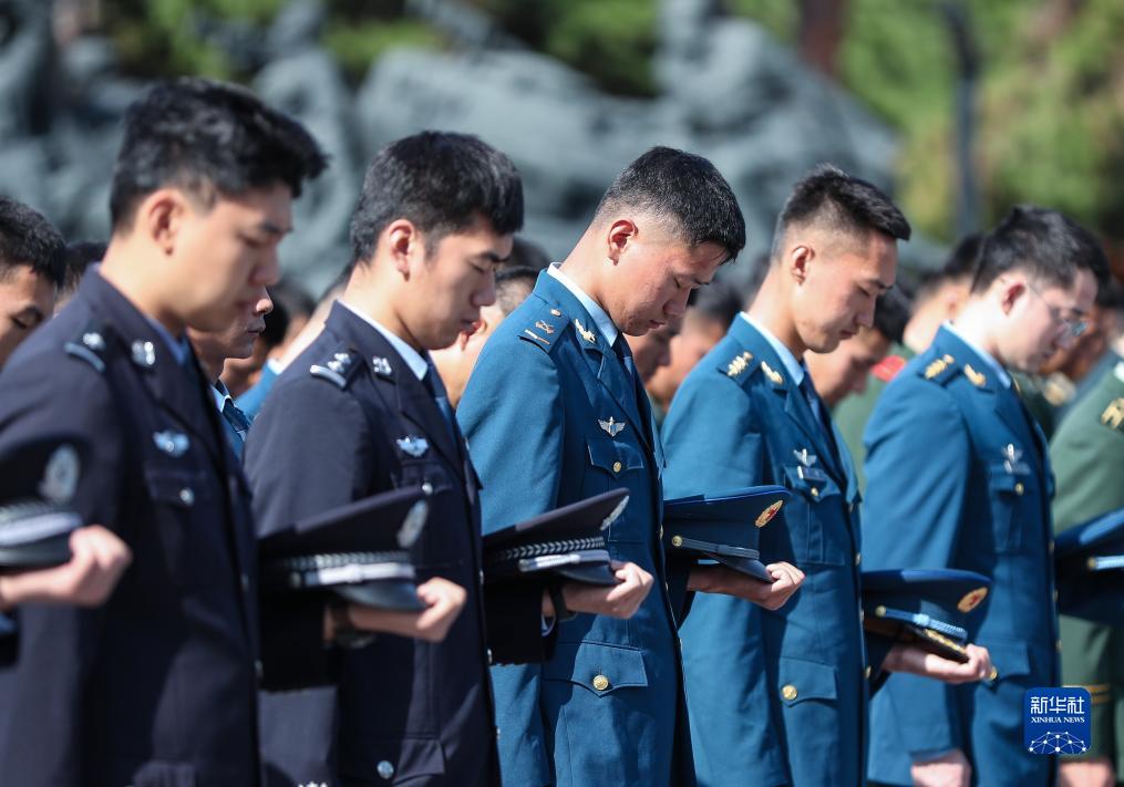 9月30日,人們在遼寧省暨沈陽(yáng)市向烈士敬獻花籃儀式中默哀。