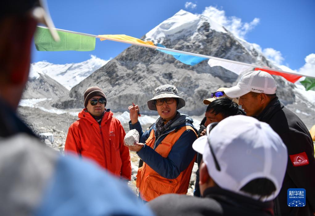科考隊隊員劉小馳(中)在為西藏登山隊隊員講解如何采集峰頂至前進(jìn)營(yíng)地的巖石樣本(9月27日攝)。