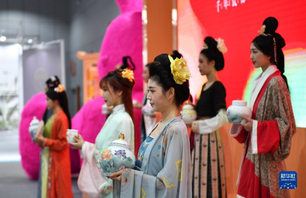 9月28日,在2023湖南(醴陵)國際陶瓷產(chǎn)業(yè)博覽會(huì )上,漢服愛(ài)好者在展示陶瓷。