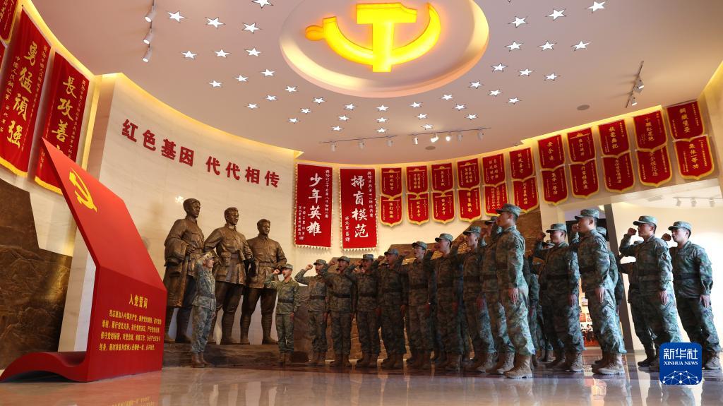 新疆軍區某紅軍師組織官兵在師史館緬懷先烈,重溫入黨誓詞(9月28日攝)。