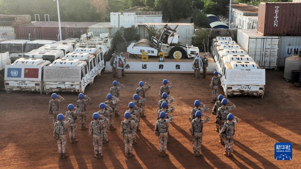 中國第10批赴馬里維和工兵分隊官兵在“5·31烈士紀念園”舉行祭奠英烈儀式,緬懷申亮亮烈士(當地時(shí)間9月29日攝)。